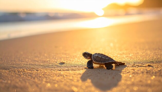 Sea Turtle Hatchling on Beach A New Beginning Journey to the Ocean at Sunrise