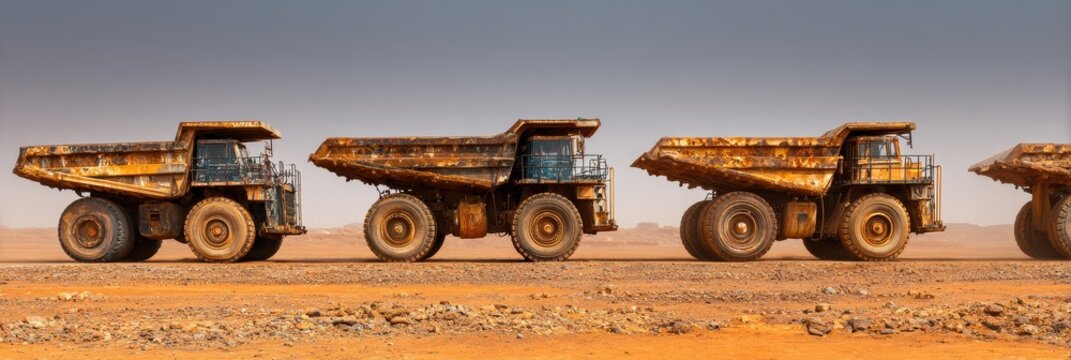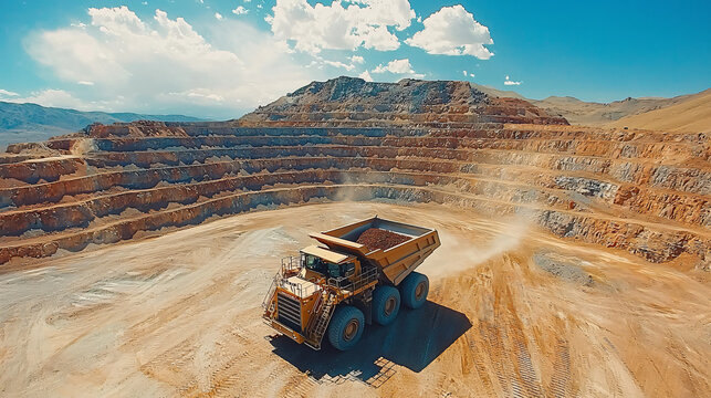 Excavator Loading Dump Truck in Open Mine A powerful hydraulic excavator fills a massive haul truck with freshly dug material in an expansive open-pit mine