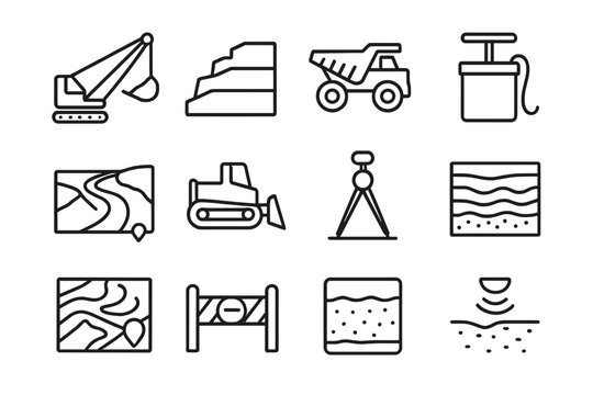 Surface Mining Icons. Outline icon set of surface mining processes: dragline excavator, overburden dump, haul