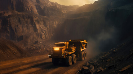 Loaded haul truck transport from open pit mining quarry, yellow truck in coal open cast mine, high production mining, heavy duty construction environments. Yellow haul truck in quarry, generative AI