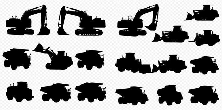A collection of black silhouettes of various heavy construction vehicles, including excavators, dump trucks, and bulldozers, on a transparent background.