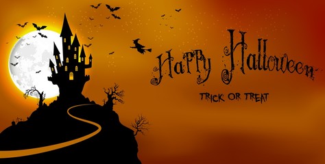 halloween haunted castle, dead tree, scary graveyard, with full moon and purple sky in the background. suitable for posters, flyers, banners and backgrounds for Halloween party invitation cards.