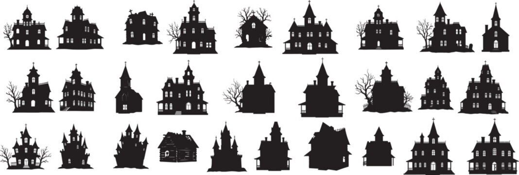 A silhouette of a haunted mansion surrounded by bare trees and gravestones under a vibrant purple sky