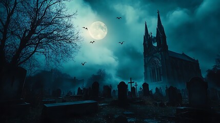 Cemetery landscape view in dark night under the moonlight, graveyard is full of tombstones and there is a chapel in background with blue and teal night sky, scary Halloween theme