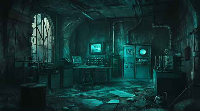 Teal glow casts an eerie ambiance on a dark abandoned laboratory filled with mysterious equipment, background, abandoned, haunting. Haunting - Ruins. Illustration
