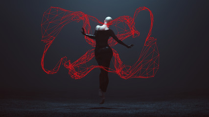 Floating Black Demon Shrink Wrapped Futuristic Haute Couture Dress and Red Neon Lattice Light Wave Abstract Demon 3d illustration 3d render