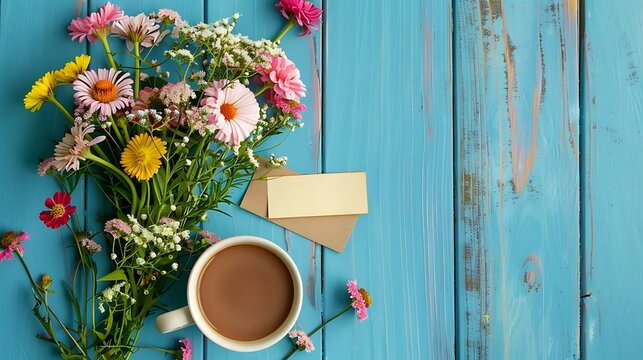 Bouquet of spring summer flowers coffee cup and notes good morning have a nice day on blue wooden table