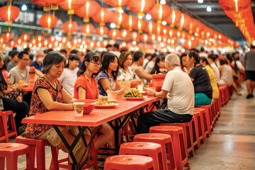 A kaleidoscope of flavors! A bustling Singapore hawker center with locals enjoying a vibrant mix of modern and traditional Asian cuisine.
