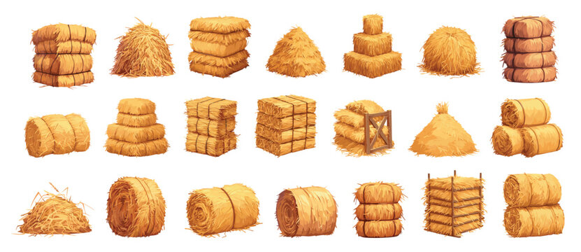 Cartoon hay bales. Haystack in rolls squares heaps piles, farm dry grass harvesting set vector illustration