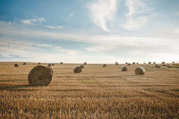 Beautiful bright sun rays under horizon over the field after harvesting. Straw bales outdoors on warm sunny summer evening.