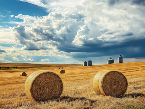Piled stacks of dry straw collected for animal feed. Dry baled hay bales stack.