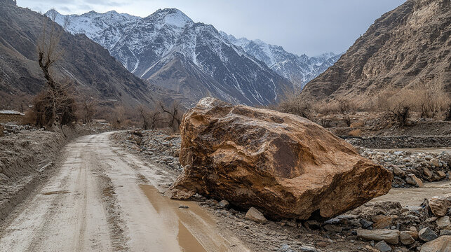 Large boulders block a mountain valley road, creating a hazardous obstruction. Rockslide causes dangerous road conditions and transportation disruption in a rugged natural landscape.