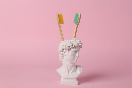 David bust vase with eco toothbrushes on pink background. Minimal aesthetic still life