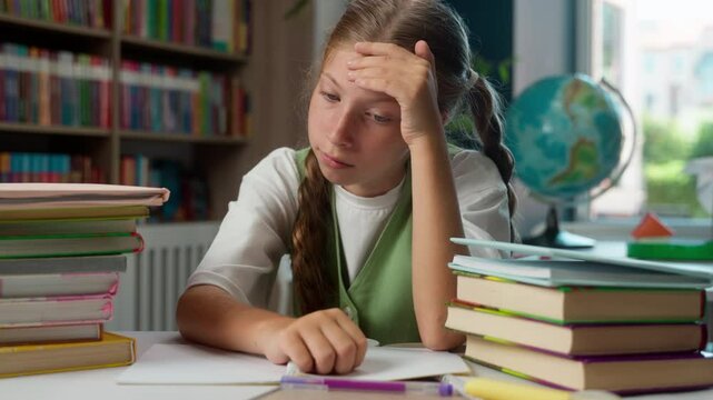 Unhealthy tired bored Caucasian little girl child kid schoolgirl school pupil learner student holding head suffering headache education burnout overload books homework boring lesson indoors classroom