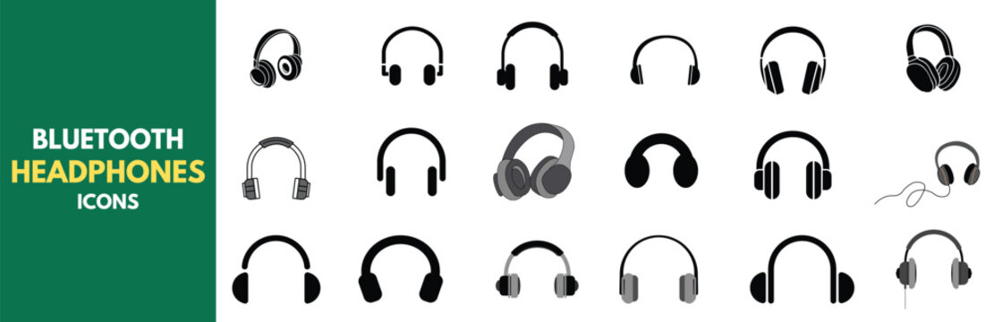 Vector illustrations of Bluetooth headphones in different shapes and styles. Ideal for music, technology, and communication themes.