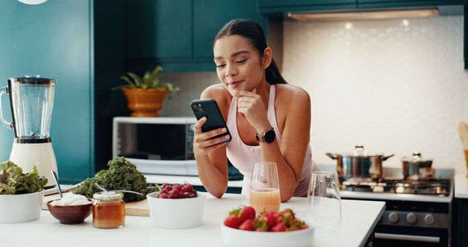 Phone, reading and woman with smoothie in kitchen for health, wellness and diet breakfast. Recipe, cellphone and female person with vegetables and fruit for nutrition juice in morning at apartment.