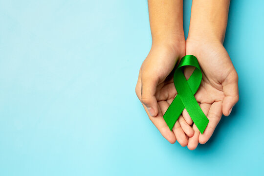 World Mental Health Day; green ribbon put in human's hands on blue background