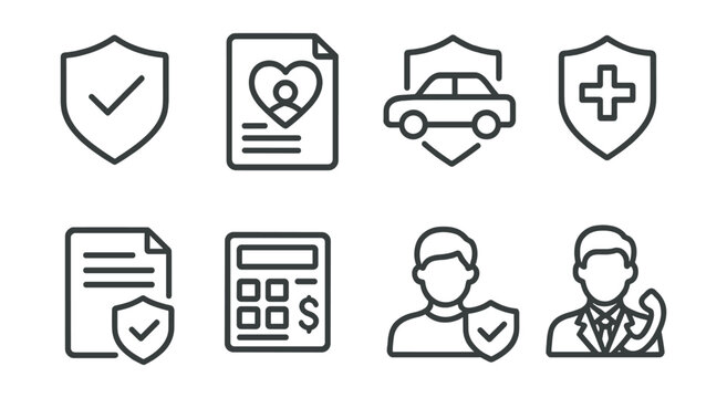 Line vector icons of insurance services: insurance shield, life policy, car coverage, health plan, claim document, premium calculator, insured icon, agent contact.