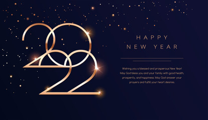 Luxury 2022 Happy New Year background. Golden design for Christmas and New Year 2022 greeting cards with New Year wishes of health and prosperity. Vector background in gold and dark blue black