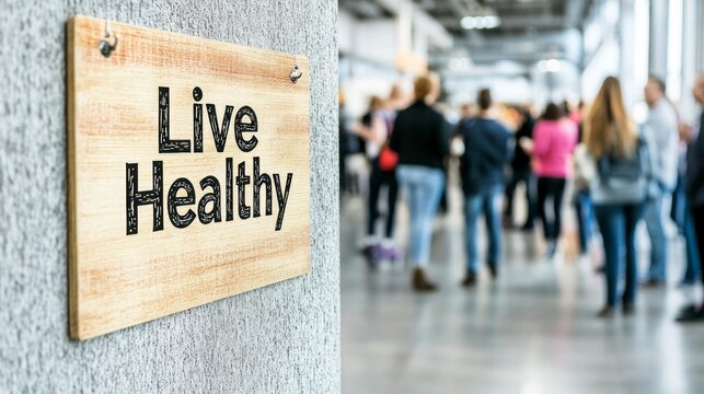 Decorative sign at health fair entrance says Stay Healthy in elegant script font. Encourages community participation, wellness, healthy lifestyle. Blurred people background. Outdoor park with trees,