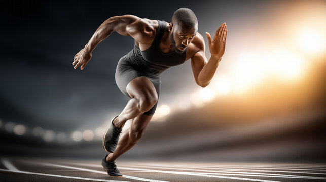 A dedicated athlete bursts forward on the track during a national running event, showcasing incredible speed and focus against a dramatic backdrop of glowing stadium lights