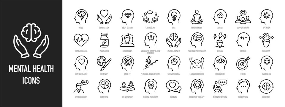 Mental health icon set. Collection of meditation, anger, anxiety, psychosis, depression and more. Vector illustration. Editable stroke.