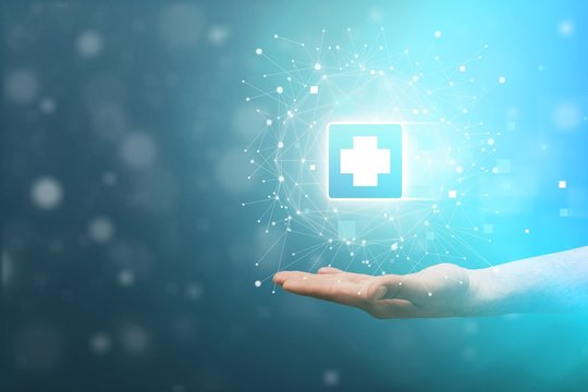 Doctor holding plus icon virtual as a concept of health, medical insurance and personal status. Mixed media. 3D Render