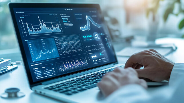 Healthcare analytics display on computer features charts tracking population health trends against purple background.