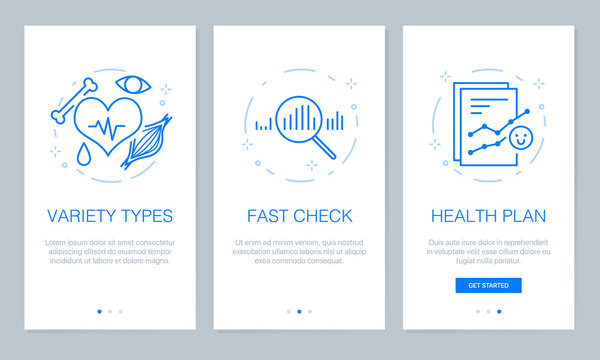 Health and medical concept onboarding app screens. Modern and simplified vector illustration walkthrough screens template for mobile apps.