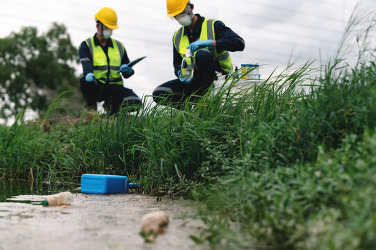 Chemical Tanks, Toxic Waste or Suspicious Pollutants Float on the Rotten Smelly Pond Water Sources Surface with Environmental Engineers Monitoring the Water Quality in the Background.