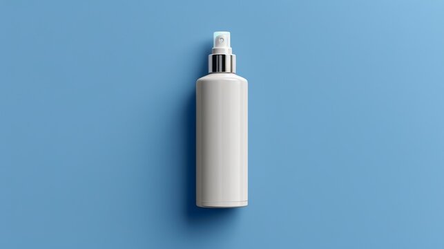 A vertically oriented white spray bottle on a serene blue background with a modern and clean aesthetic