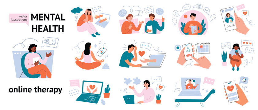 Mental health illustrations set, online therapy compositions, collections of vector scenes with therapists and patients, men and women in stress and depression, positive support and help