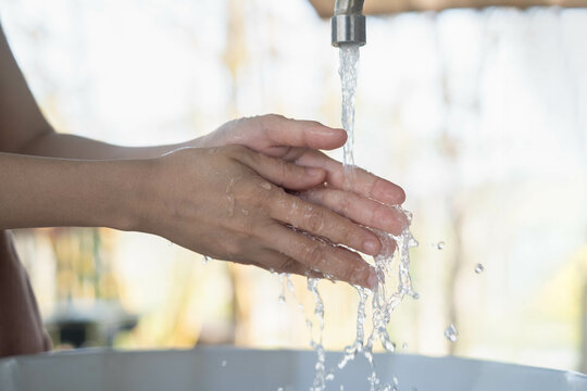A person washing their hands under running water, emphasizing cleanliness and hygiene in a bright outdoor setting.