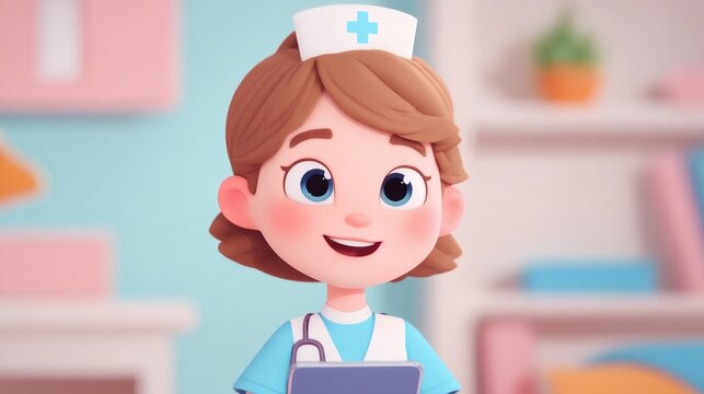 Smiling 3D cartoon woman nurse with a stethoscope. Digital medical character for healthcare technology and telemedicine concept. Pediatric care.