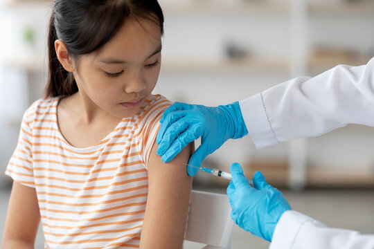 Medical professional in gloves is giving a vaccine to a young girl in a striped shirt at a clinic. The setting is bright and clean, focused on healthcare and wellbeing.