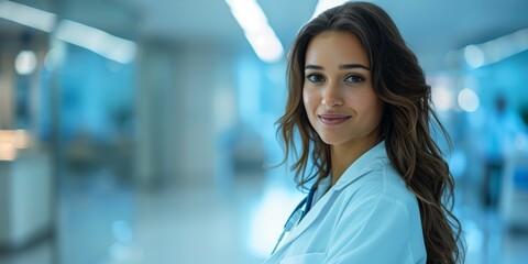 Blurred light background of modern hospital corridor exudes a calm and clean atmosphere with no people present. Concept for medical presentations, brochures, health-related articles and blogs