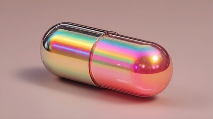 Creative 3D render of an iridescent rainbow-colored pill capsule. Ideal for pharmaceutical innovation blogs, futuristic medicine articles, and modern healthcare tech landing pages.