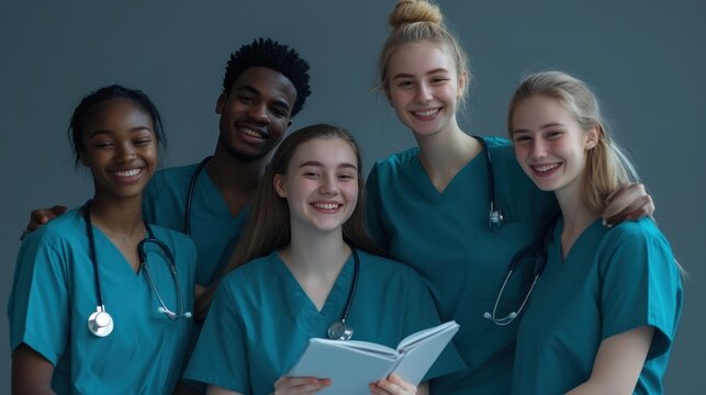 Five healthcare students pose together, all smiles, while holding a medical textbook in a study session