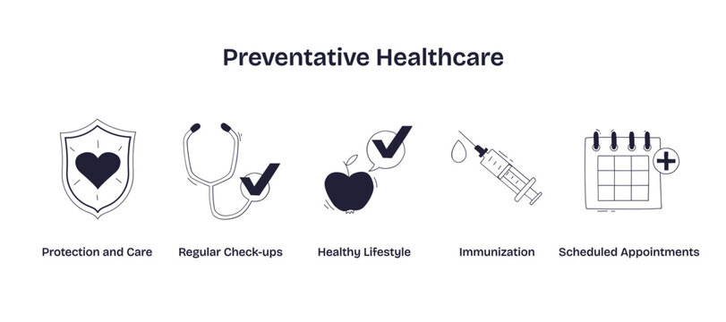 Preventative healthcare is illustrated with a shield, stethoscope, apple, syringe, and calendar, representing protection, check-ups, healthy habits, and immunization, transparent background.