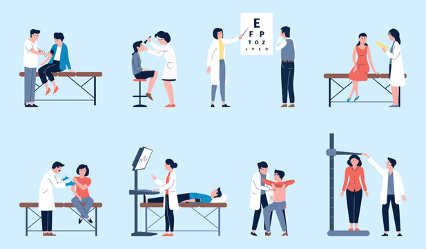Medical check up, healthcare policy and research. Doctors and patients in hospital scenes. Treatment and sick prevention, recent vector concept