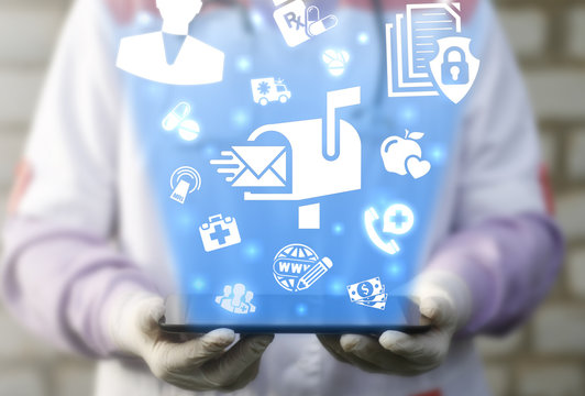 Health care medicine digital email marketing business concept. Mail box envelope medical communication post e-mail people message online chat healthcare technology