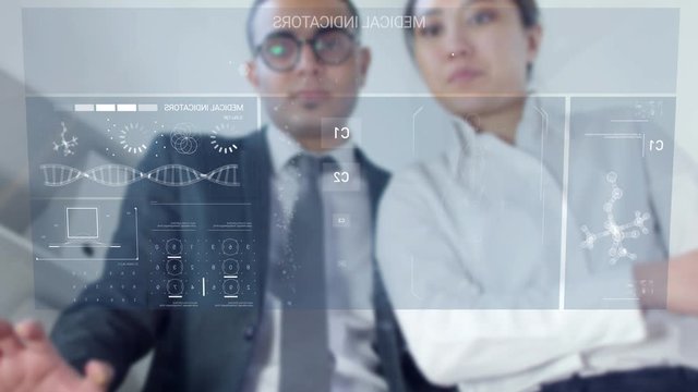Low angle view through AR monitor of male and female colleagues in formalwear tapping and swiping on touchscreen while discussing medical indicators