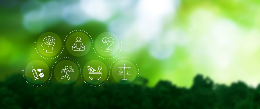 Wellness longevity and Holistic Concept. health care, including mental wellbeing, fitness, nutrition, sleep, relationships and financial balance, Personal development and balance.