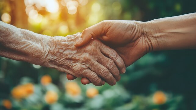 A young hand holding an elderly hand, symbolizing family support and care for the elderly
