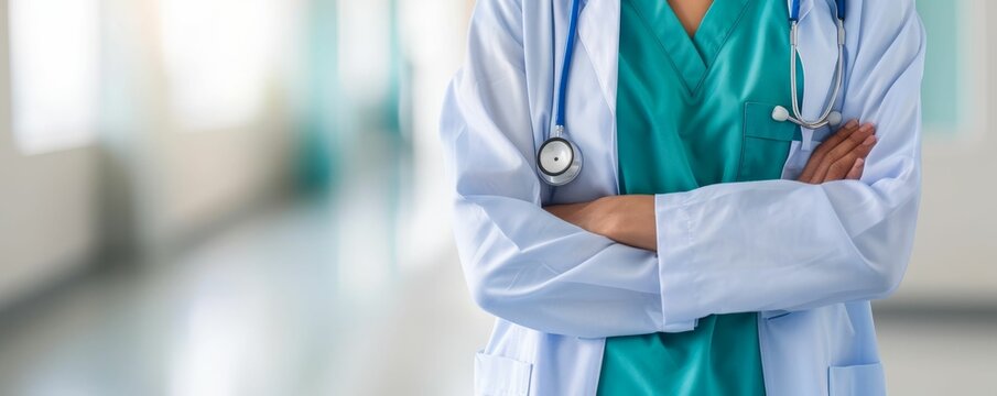A healthcare professional in scrubs and a stethoscope stands confidently in a hospital corridor, embodying expertise and care.