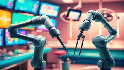 Robotic surgical instruments engaged in precision operation, set against high-tech medical monitors in a modern operating room
