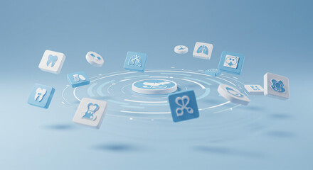 Floating healthcare icons representing various medical services and specialties against a soft blue background