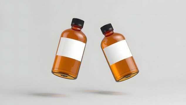 Two levitating amber glass bottles with blank white labels for a product mockup. Versatile template for cosmetic, oil, or medicine packaging