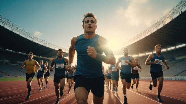 Sprinter on track, getting ready to run, with stadium background, sports and healthy lifestyle concept