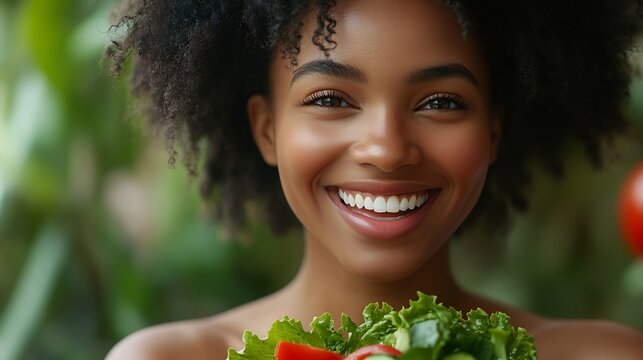 Smiling woman holding fresh salad promotes healthy eating